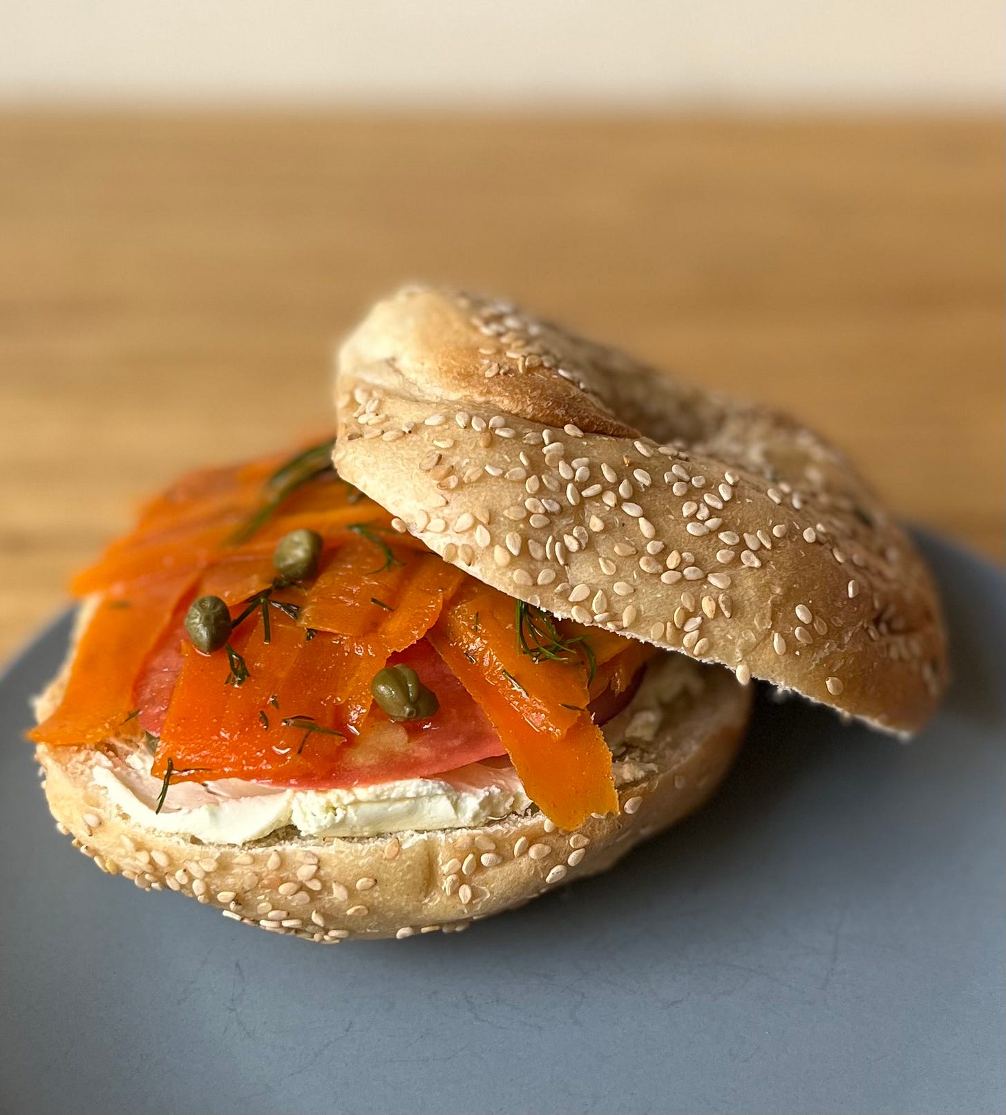 More recently, other plant-based lox products have cropped up. There’s Goldie Lox, a San Francisco-based company that makes packaged carrot lox. (At the moment, they are only sold locally in the Bay Area.) And in Chicago, the all plant-based delicatessen Sam & Gertie’s offers their bagels topped with tomato-based “laks.” “We start with flash poached tomatoes then pack them in seasoned salt and sugar and let them cure for up to 36 hours, depending on the water content in the tomatoes,” said owner Andrew Kalish. “They take a while to make, but that is similar to the process of turning raw salmon into lox.”