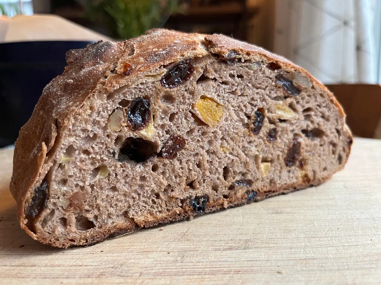 This bread has a hearty, crunchy crust and a wonderfully chewy crumb. It comes perfumed with cinnamon and loaded with walnuts and dried fruits like raisins, dried cherries, figs, apricots, and dried apples.