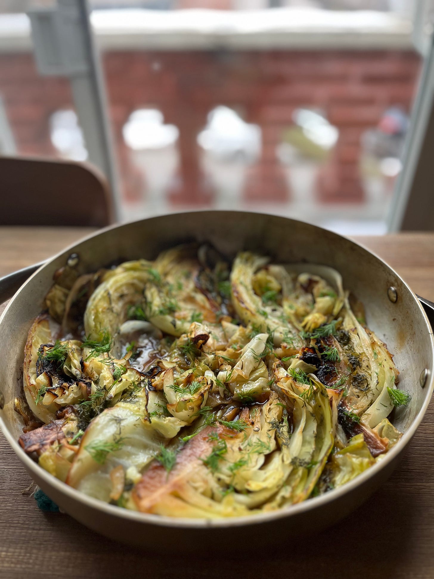 Cabbage is both a comfort and a muse of the Ashkenazi kitchen—an inevitability and a delight. Needless to say, I am a forever fan. And with this week’s recipe, which sears meaty wedges of cabbage until they are blistered and brown, braises them in a flavor-packed broth, and showers the whole mess with a heap of fresh dill, I unpacked a whole new level of love for the crunchy crucifer. Four year old me would be so proud.