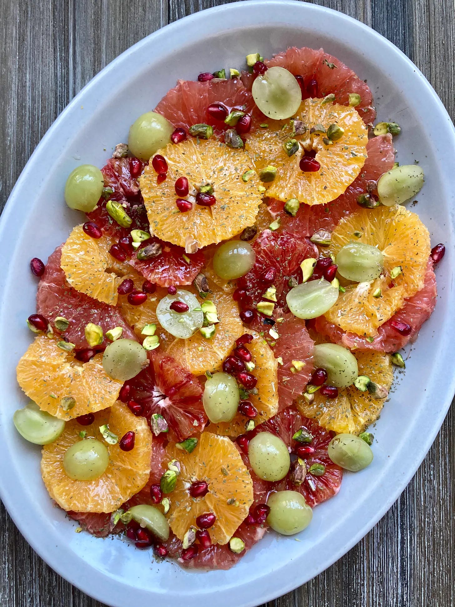 Overlapping layers of sunny citrus, crisp and juicy grapes and pomegranate seeds, and nutty pistachios, all drizzled with golden honey.