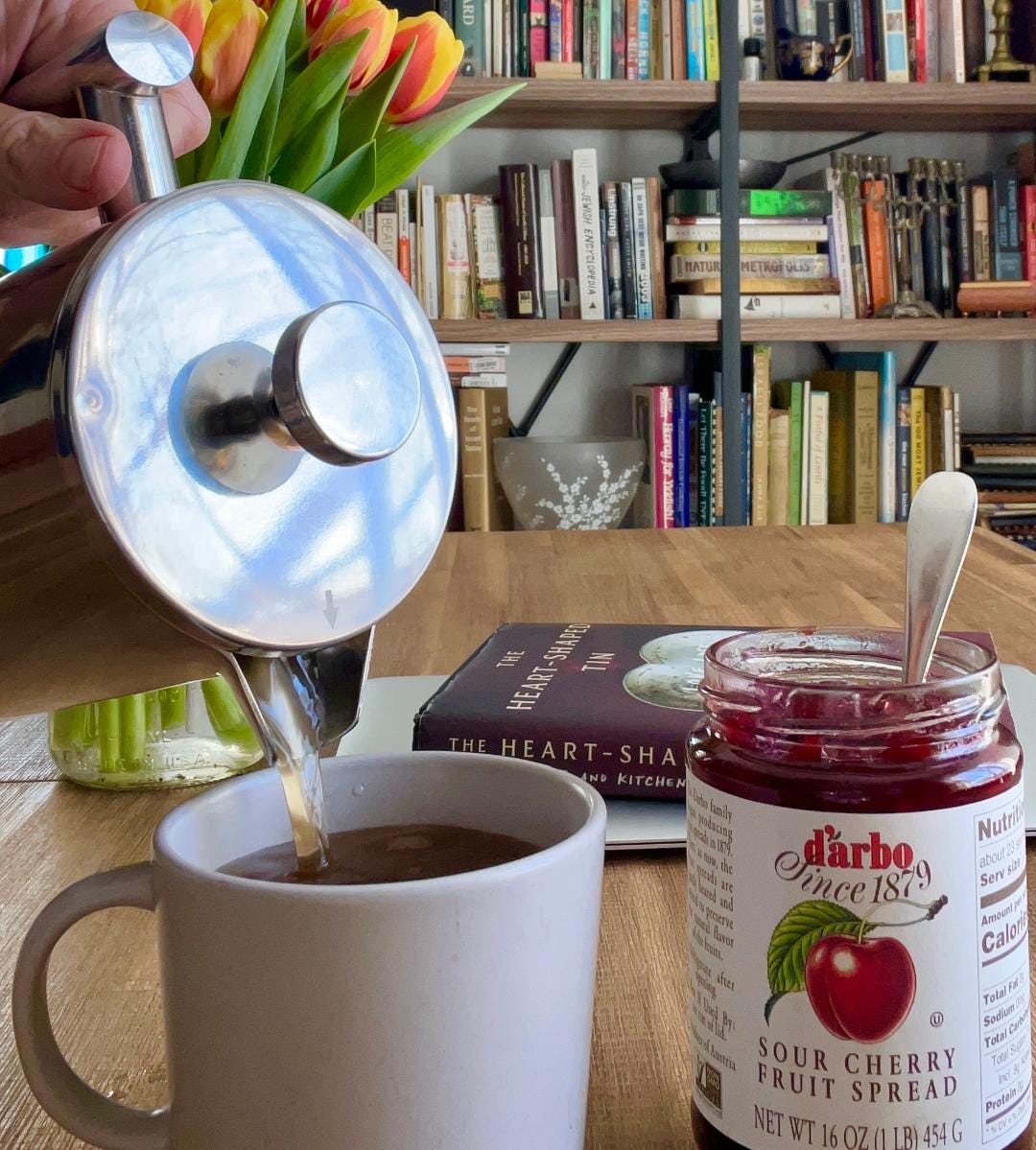 More recently, I have started brewing an afternoon pot of black tea in our French press, enjoying the day-brightening ritual of plunging loose tea leaves through hot water, and stirring my cup with a generous dollop sour cherry jam, just like my Jewish ancestors did. It is a change in routine for our beloved French press, but she has taken to the evolution with (ever so slightly coffee-scented) grace.